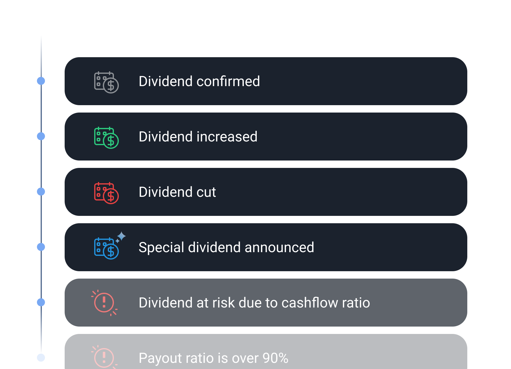 Receive timely updates on dividend declarations, payment changes, and potential risks to your dividends, all informed by our comprehensive analysis and forecasts.