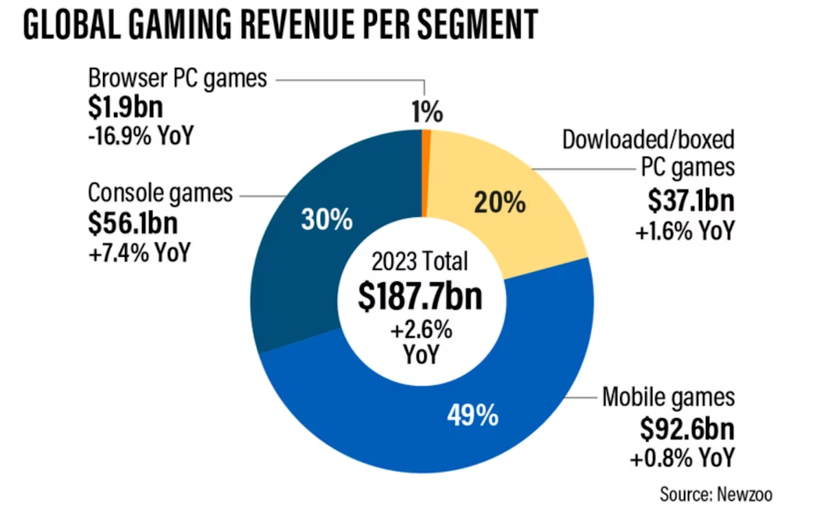 In 2023 the global gaming industry is estimated to generate between $188bn and $396bn in revenue. While I know that’s a huge range, estimates differ based on the definition of “gaming” revenue. They’ve grown at 11 - 15% annually over the last five years.
