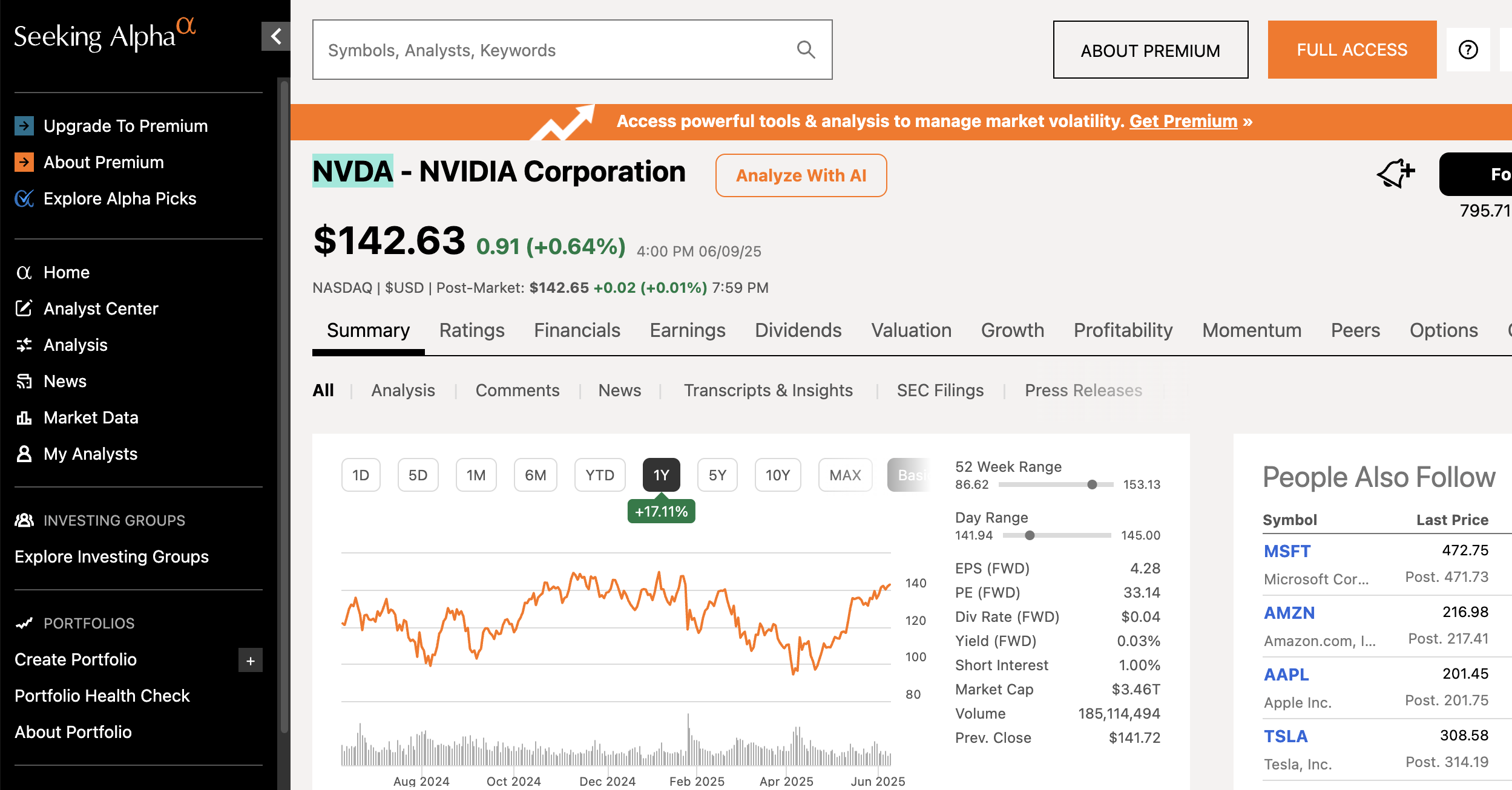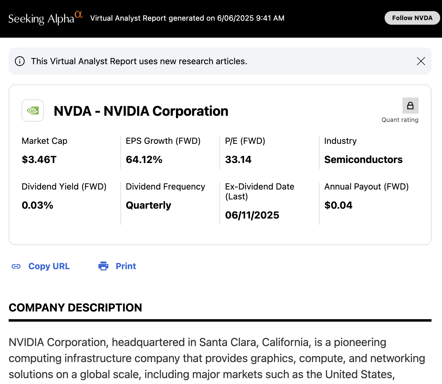We also tested the new "Virtual Analyst Report" from Seeking Alpha however this turned out to actually be an AI/ LLM generated summary of the recent articles on the company, the same as plugging articles into ChatGPT, you can see a preview below.