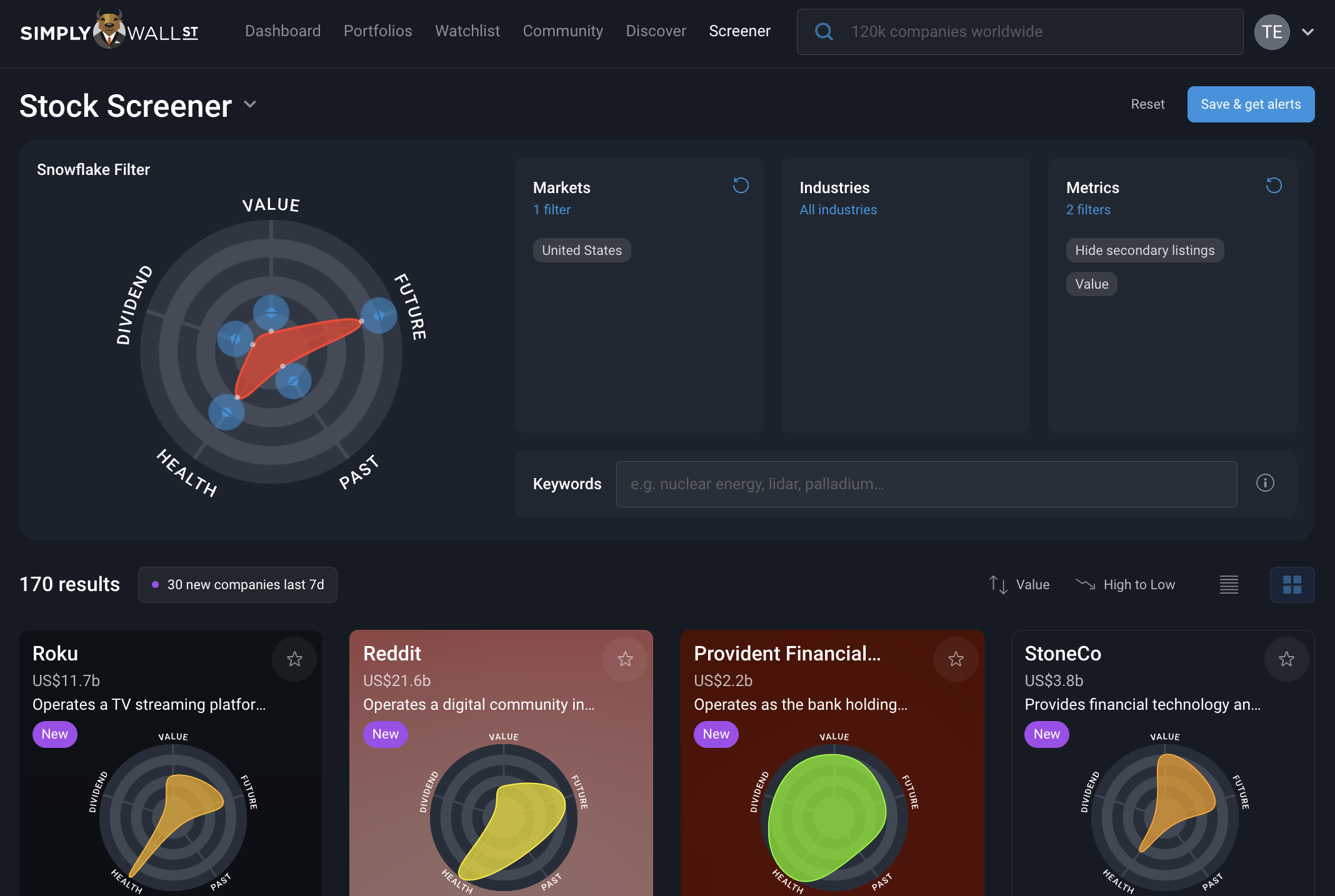 - Simply Wall St sends alerts on Saved Screeners - when a new stock matches you get an email