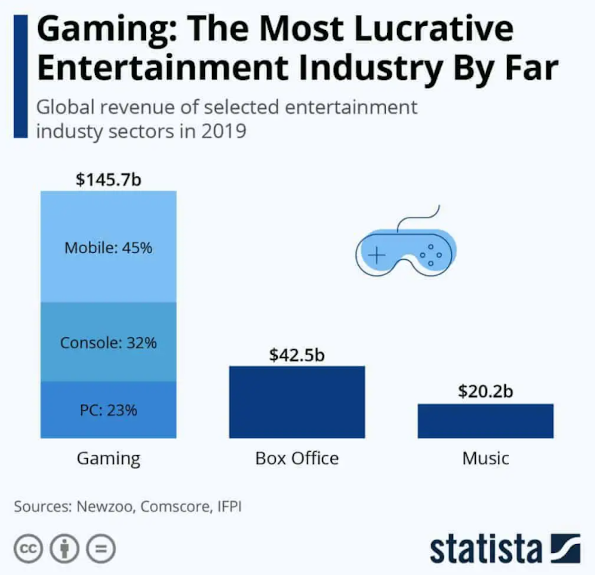 In fact, this has been the case for quite a while. The chart below shows how global gaming revenue compared to movies and music combined in 2019, and this was prior to the pandemic, which, as you may have expected, caused the gap to widen even further.